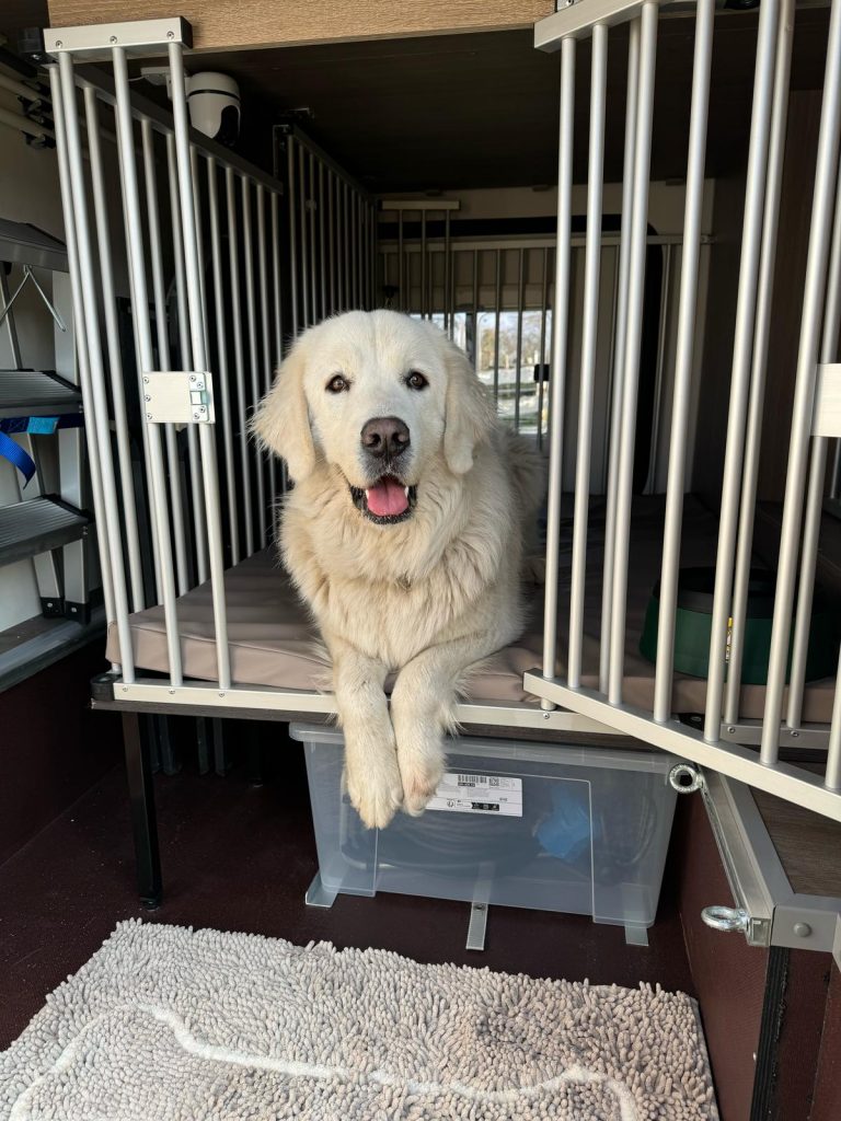 Eine große Hundebox, eine Außendusche, Klimaanlage, Kameraüberwachung und viele praktische Details, die das Reisen mit Hund entspannter machen.